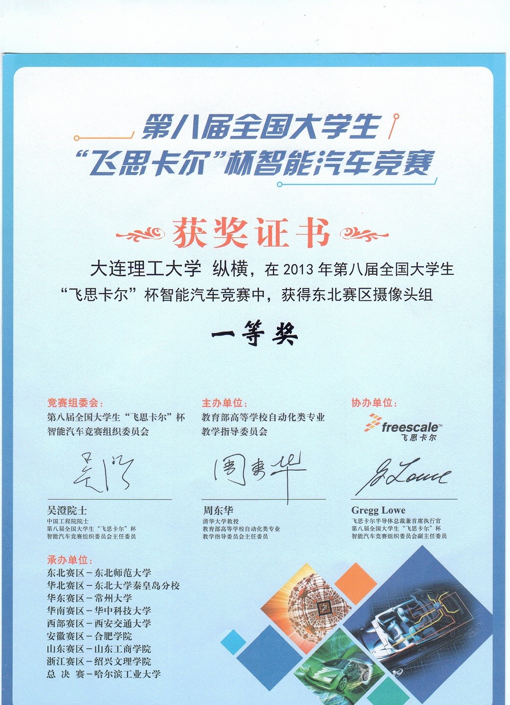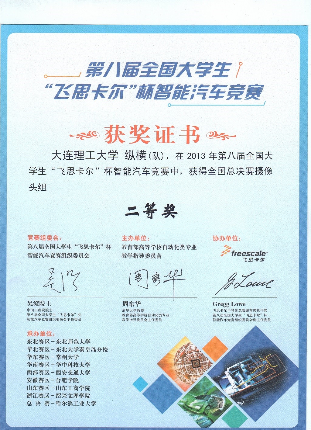 2013年第八届“飞思卡尔杯”全国大学生智能车竞赛全国二等奖1项,赛区一等奖1项,二等奖5项;
