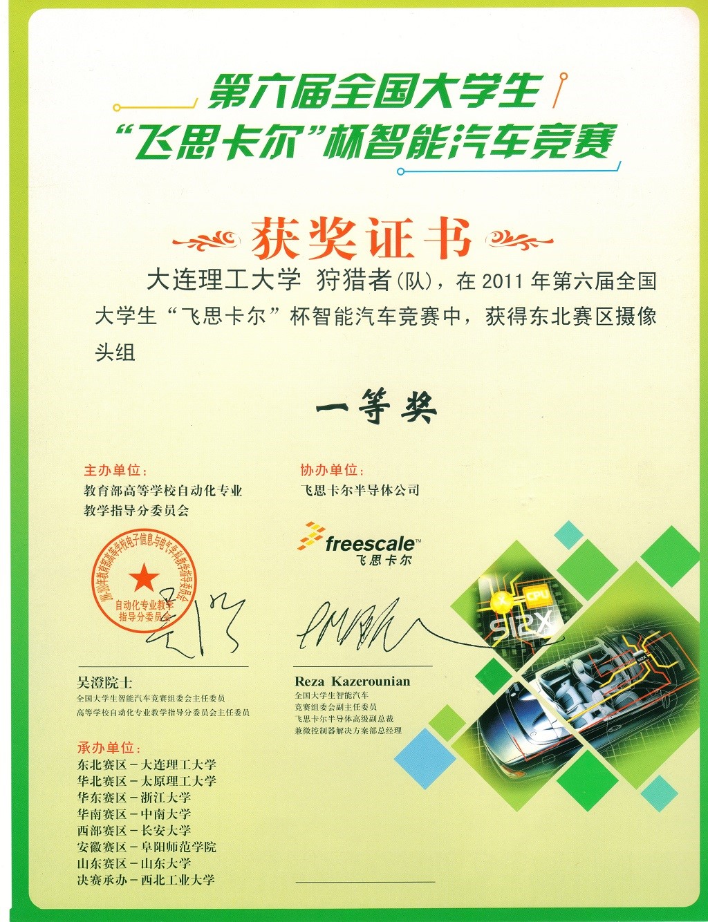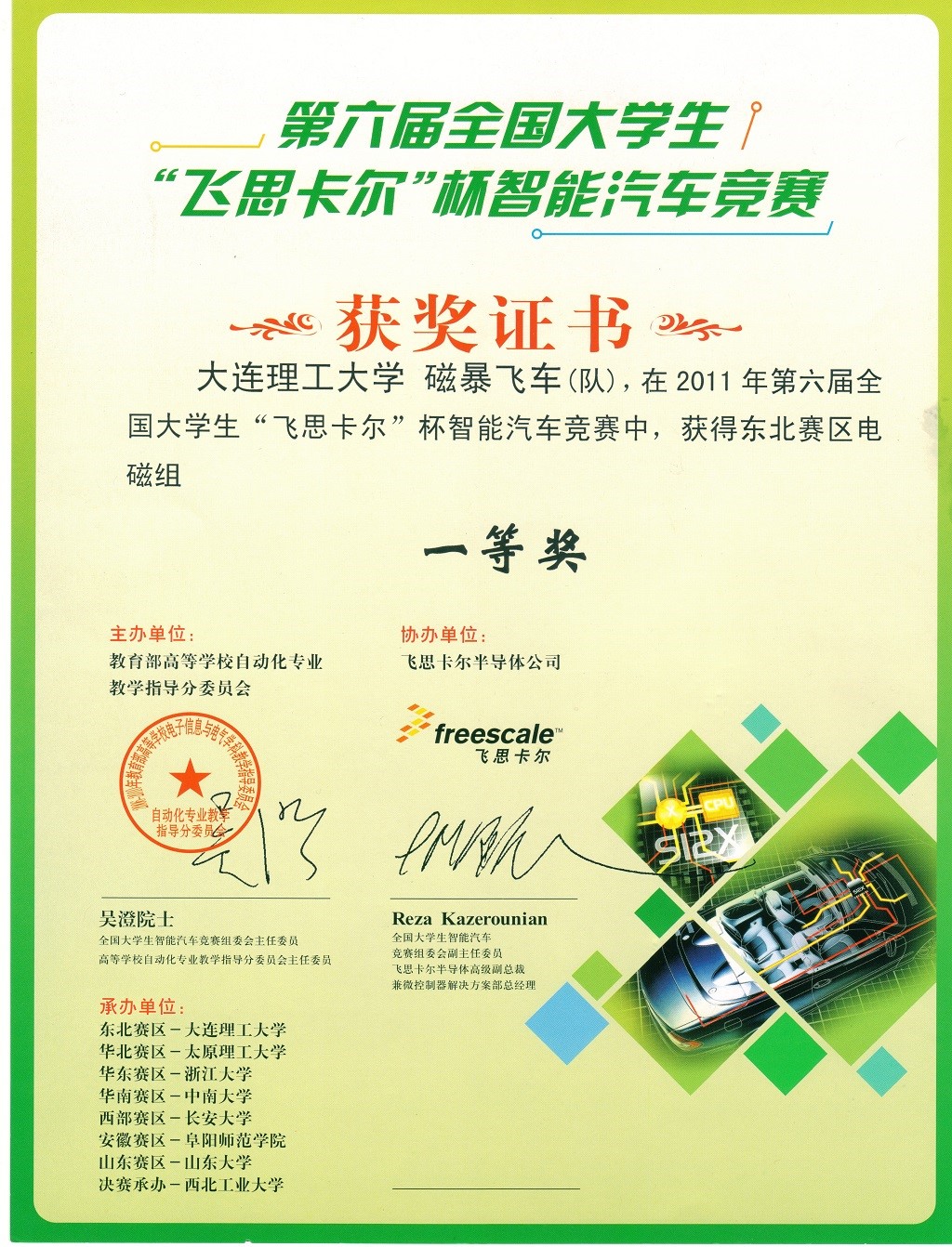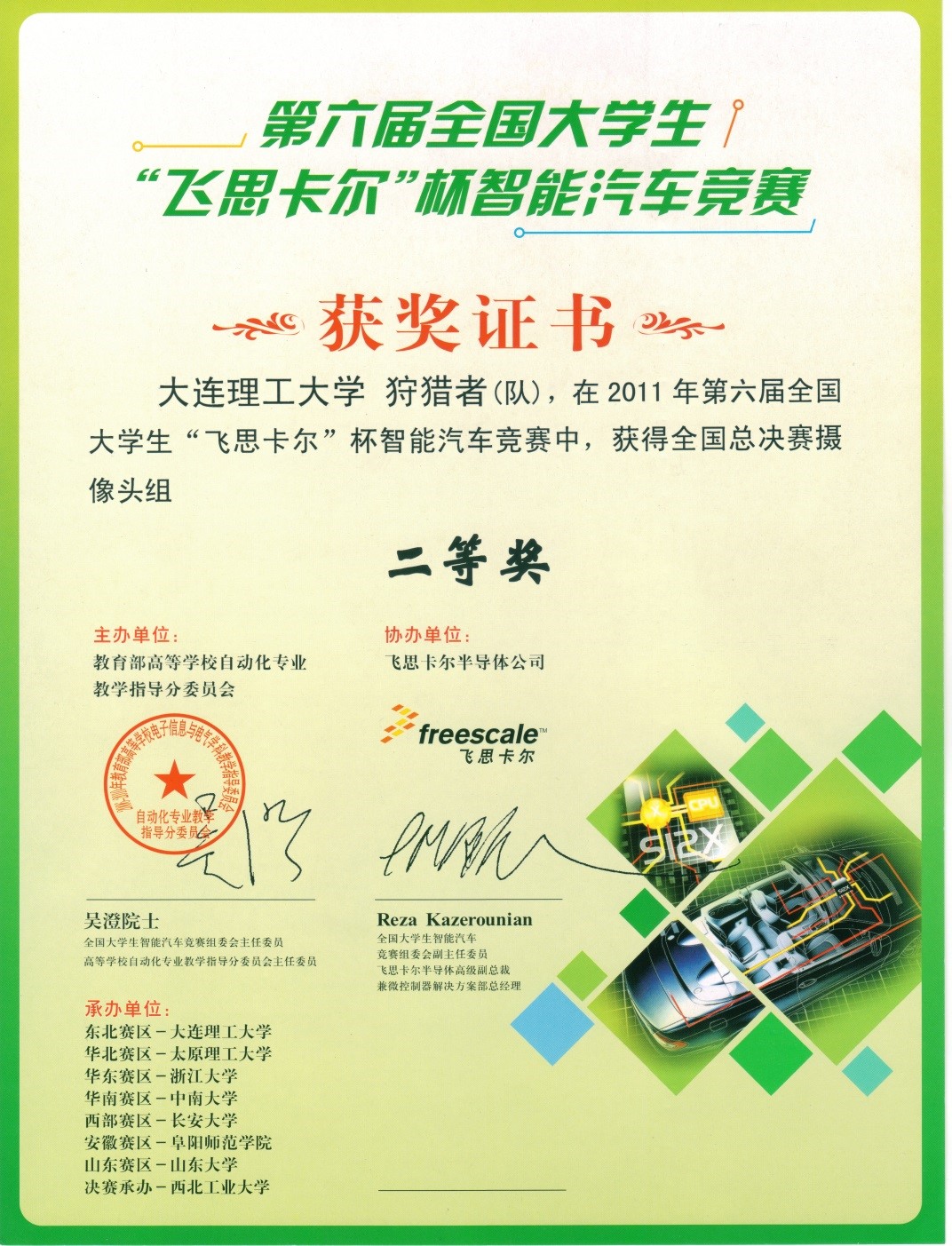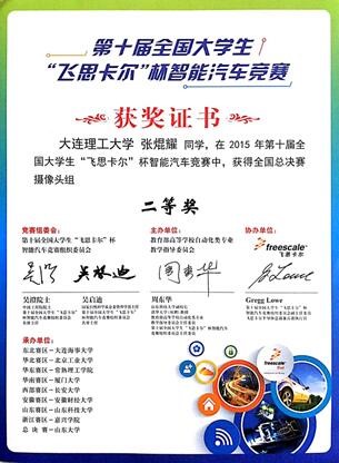 2011年第六届“飞思卡尔杯”全国大学生智能车竞赛全国二等奖2项,赛区一等奖2项,二等奖4项;