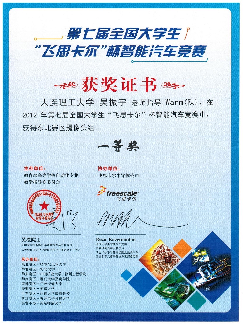 2012年第七届“飞思卡尔杯”全国大学生智能车竞赛全国二等奖1项,赛区一等奖2项,二等奖1项;