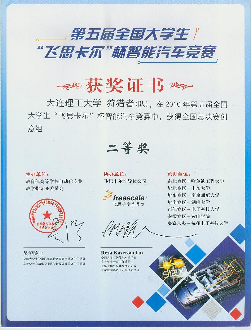 2010年第五届“飞思卡尔杯”全国大学生智能车竞赛全国二等奖2项,赛区一等奖1项,二等奖5项;