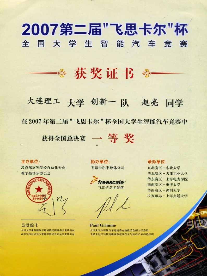 2006年第一届“飞思卡尔杯”全国大学生智能车竞赛全国三等奖2项;2007年第二届“飞思卡尔杯”全国大学生智能车竞赛全国一等奖2项,赛区一等奖2项;