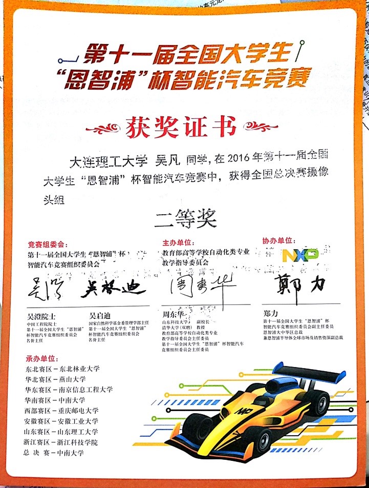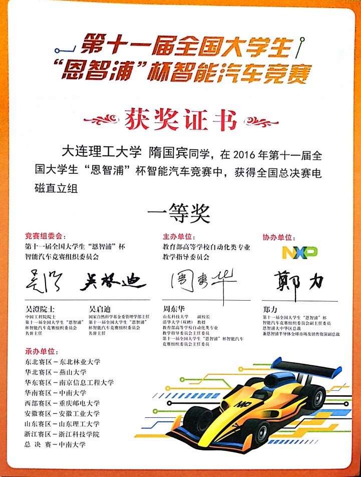 2016年第十一届“恩智浦杯”全国大学生智能车竞赛全国一等奖1项,二等奖1项,赛区一等奖2项,二等奖1项