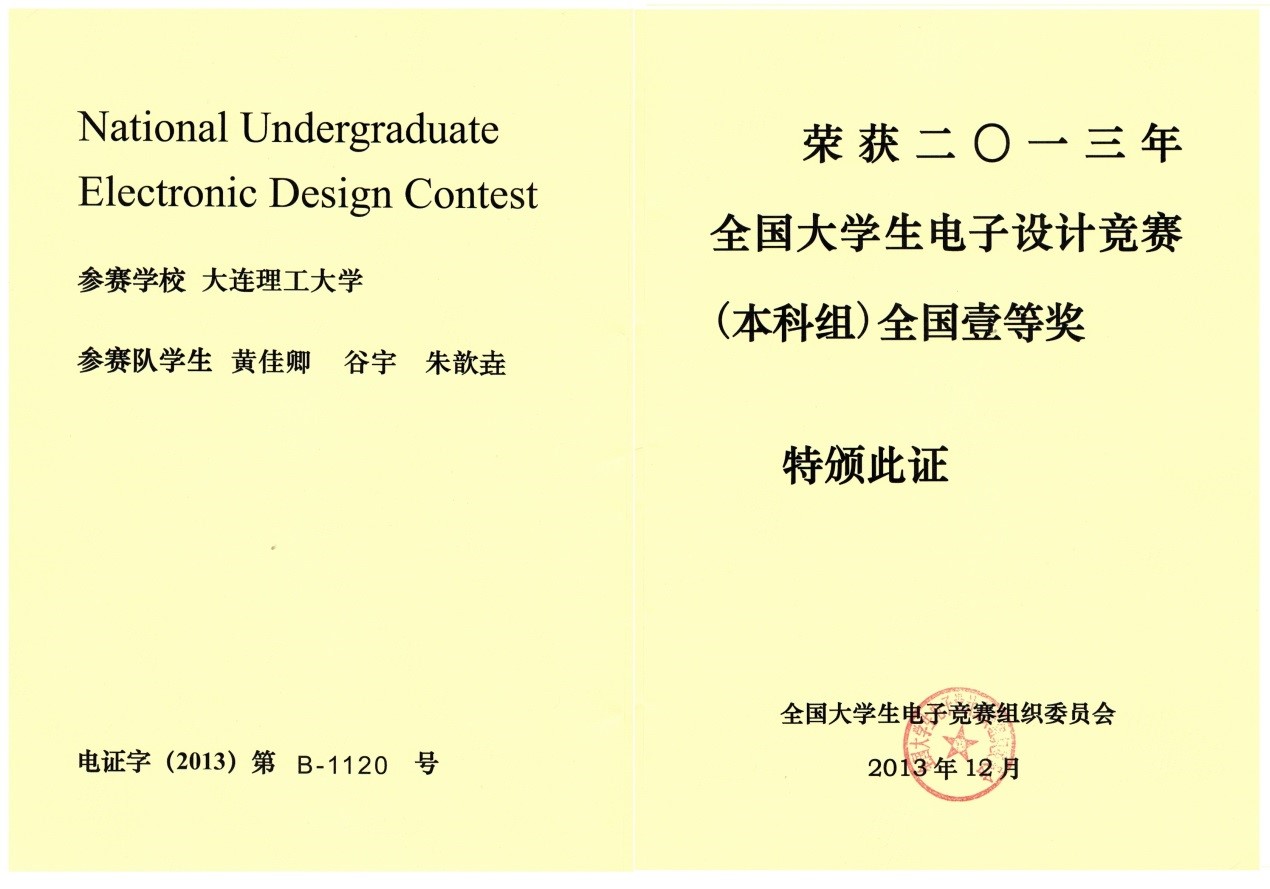2013年全国大学生电子设计竞赛全国一等奖1项,二等奖2项。;