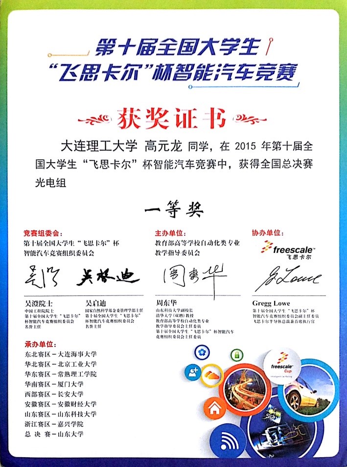 2015年第十届“飞思卡尔杯”全国大学生智能车竞赛全国一等奖1项,二等奖1项,赛区一等奖2项,二等奖2项
